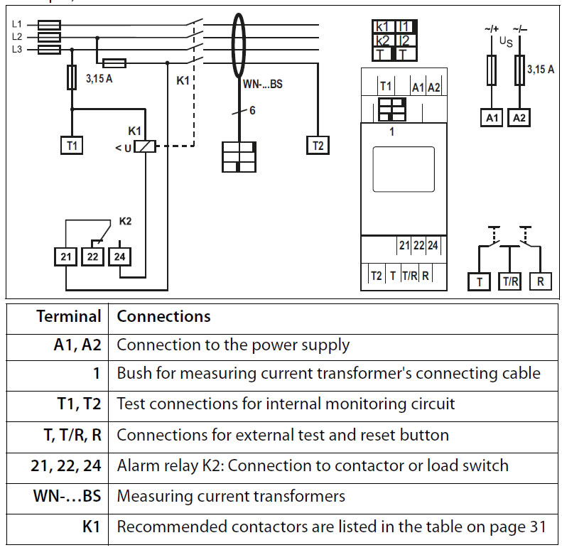 In cazul unui curent rezidual nominal IΔn de 6 mA, releul va comuta un releu de alarma si contactorul asociat, in conformitate cu timpul de operare specificat in UL943.